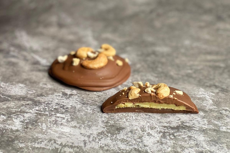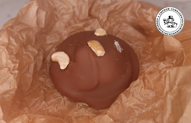 Сырный медиант «Манго - Маракуйя - Дорблю» изготовлен вручную из молочного бельгийского шоколада с начинкой из манго, маракуйи, сыра Дорблю и украшен орешками кешью.
