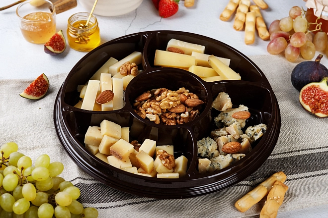 Всё содержимое сырной тарелки мы отправляем в специальной пластиковой менажнице, которая плотно закрывается прозрачной крышкой.